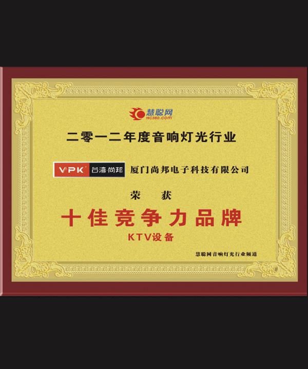 2012年“十大竞争力品牌”牌匾